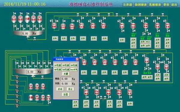 4、動態(tài)的工藝流程顯示畫面,操作人員可通過彩色顯示器直觀地監(jiān)視整個配料控制過程,包括輸送設(shè)備的工作狀態(tài)、秤量數(shù)據(jù)、混合機(jī)和各種工藝閘閥門的工作狀態(tài)等;
