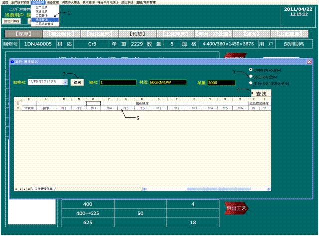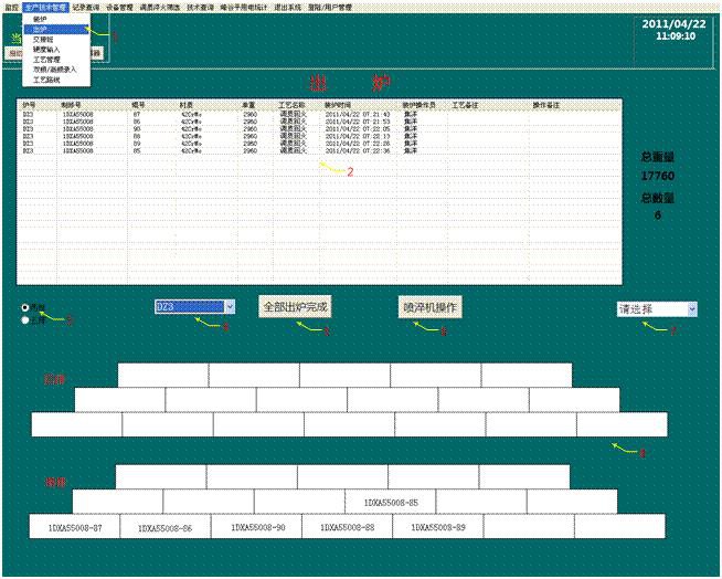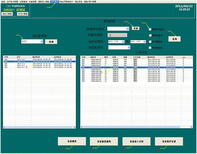 該界面用于系統(tǒng)的查詢爐次信息,工件信息。并且方便的查詢所選工件的溫度信息,硬度信息,加工過程信息,裝爐位置信息。