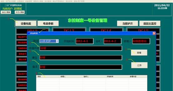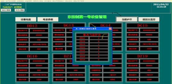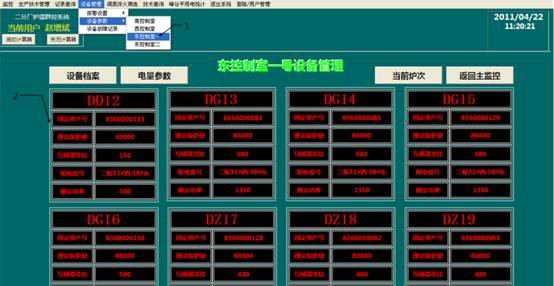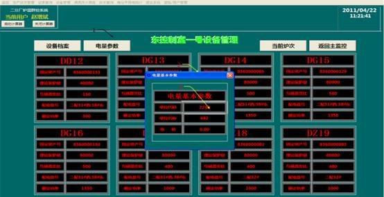 設(shè)備參數(shù)界面共分為四個(gè)界面,分別是:南控制室、東控制室(1)、東控制室(2)、西控制室。此界面分為四部分;1、基本參數(shù):能夠?yàn)橛脩籼峁┰O(shè)備的基本參數(shù),此參數(shù)包含:固定資產(chǎn)號(hào)、理論裝爐量、互感器變比、配電盤號(hào)、額定功率。2、設(shè)備檔案::能夠?yàn)橛脩粲涗浢颗_(tái)設(shè)備的故障原因及維修狀況。3、電量參數(shù):能夠是用戶方便快捷的更改電價(jià)、單位代碼、單位名稱,并且應(yīng)用于整個(gè)能源系統(tǒng);4、當(dāng)前爐次:當(dāng)爐次不對(duì)時(shí)或錯(cuò)誤時(shí)能夠快捷更改爐次。