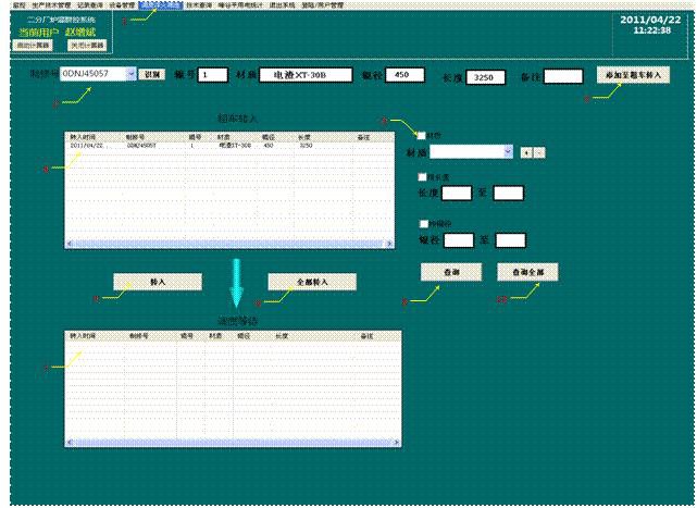 該界面用于向粗車轉(zhuǎn)入中添加工件,并按照一定的條件從粗車轉(zhuǎn)入中向調(diào)質(zhì)等待中轉(zhuǎn)入工件。